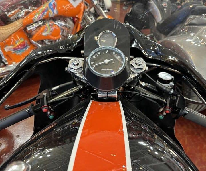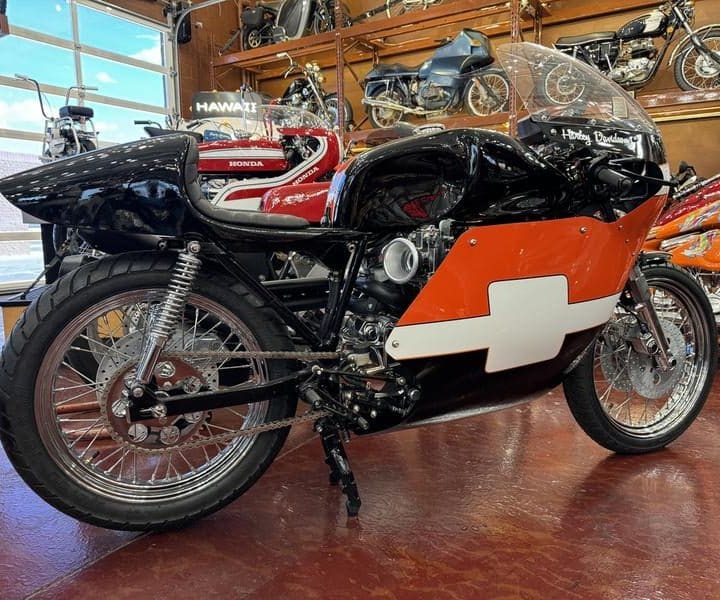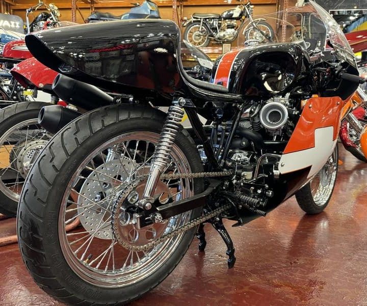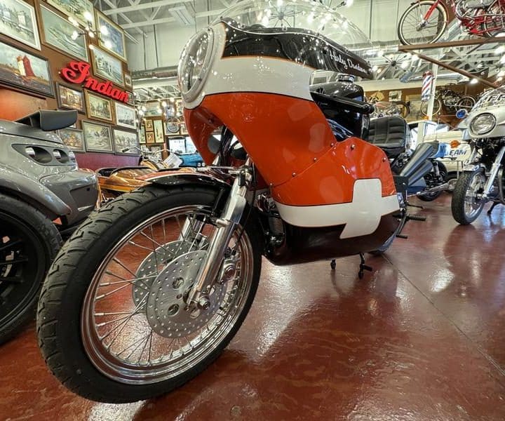 Featuring: Airtech Streamline fairing & gas tank, Color matched Harley Race Orange 2 part paint scheme, New 19″ 40 spoke front & rear wheels, Polished twin disc front brakes, Custom chassis, Custom under seat oil tank, Polished cases, New barrels & pistons, Extensive head work including oversized valves, New oil pump, Custom exhaust system, Mikuni HSR45 carb, Custom rear sets, Harley tach, Custom hand controls & switches, GPS speedometer, New period correct coil-over shocks, Lithium battery, Upgraded alternator charging system, New high performance 1.4kw starter, Hidden LED blinkers, Polished rear caliper, New drilled brake rotors, Custom stainless steel fairing mounts, Hand stitched leather seat, Remote oil cooler, Monza Gas cap, New stainless steel hardware throughout.